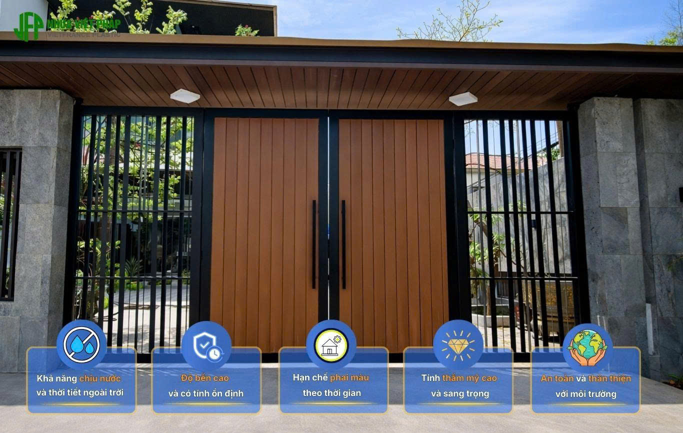 Cổng gỗ nhựa composite gần như không thấm nước, không bị mối mọt và ít bị ảnh hưởng bởi sự thay đổi nhiệt độ. Điều này giúp cổng giữ được hình dáng ổn định, vận hành trơn tru và đảm bảo tính thẩm mỹ lâu dài.