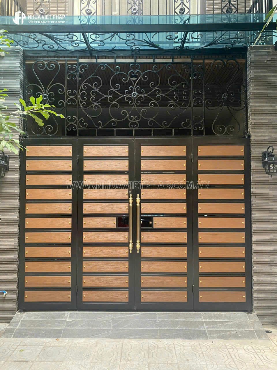 - Cổng gỗ nhựa kết hợp sắt nghệ thuật
