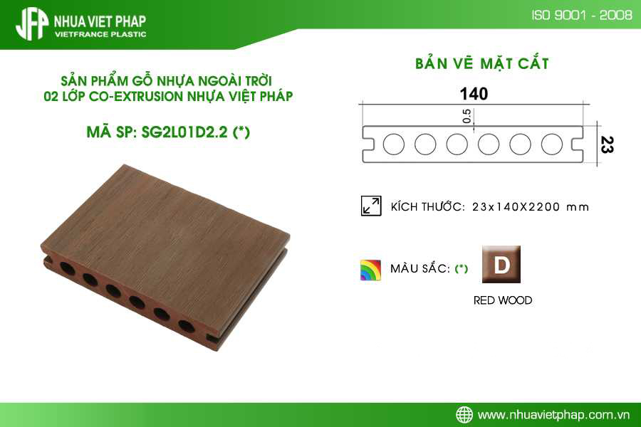 Thông số kỹ thuật sàn gỗ nhựa PE ngoài trời 02 lớp hi-class Nhựa Việt Pháp màu đỏ gỗ SG2L01D2.2